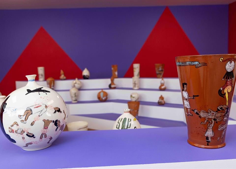 Las historias que representa el artista en las cerámicas son las que lee en diarios de nota roja. Un ejemplo es el jarrón titulado Recuerdo de la terminal Estrella de Oro, Cuernavaca, 2019, que cuenta la historia de una matanza en esa central de autobuses: