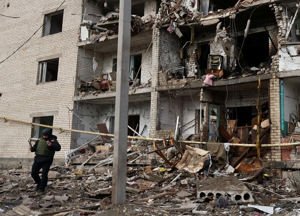 Agente del orden ucraniano camina entre los escombros de un edificio residencial dañado tras un presunto ataque aéreo. (FOTO DE AFP)