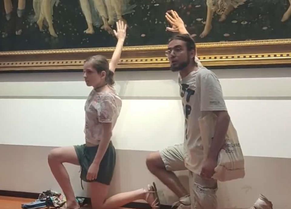 , adhirieron sus manos con pegamento instantáneo a "La primavera", una de las obras más famosas de Sandro Botticelli, que se exhibe en el museo Galeria degli Uffizi en Florencia.