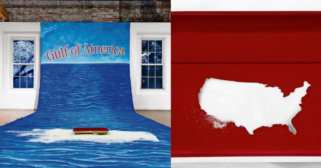 Golfo de América consiste en una tela de 3 metros por 10 que representa el agua del mar y al centro tiene escrito el nuevo nombre que le asignó Donald Trump a inicios de año, escrito con la misma tipografía que maneja la oficina presidencial. Al centro, en el suelo, hay casi 30 kilos de sal, como representación de las drogas sintéticas, y arriba está una charola con la silueta de Estados Unidos.