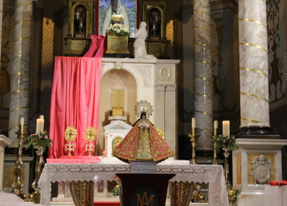 Acto seguido, tras colocar una mampara y una tela traslúcida, las hermanas religiosas presentes realizaron el cambio de vestido de color rosa de la Virgen del Roble, mientras se realizaba el rezo del Santo Rosario.