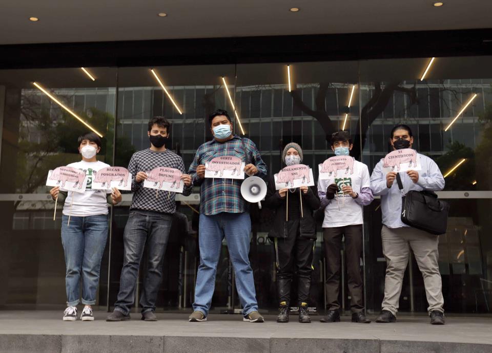 CIUDAD DE MÉXICO.- La comunidad del Centro de Investigación y Docencia Económicas (CIDE) realiza protesta afuera de la sede principal del Consejo Nacional de Ciencia y Tecnología (Conacyt