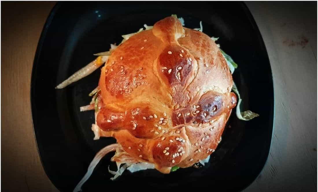 , es una combinación de la forma de pan de muerto u hojaldra - como se conoce en Toluca-, es pan con la forma tradicional, decorado con ajonjolí, lleva carne, lechuga, queso, salsa y aunque ha extrañado a los comensales, se volvió en una de las estrellas de Mc Lenas, dijo María Magdalena Dotor, la creadora del lugar.