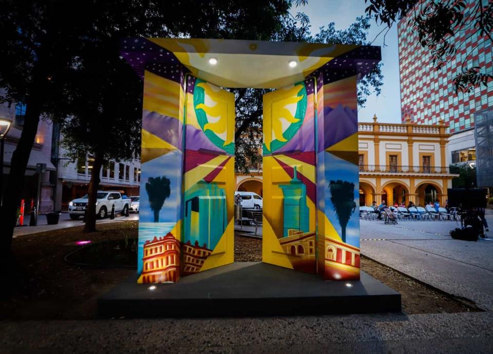 En la Alameda se instaló la puerta decorada por Adán Sánchez, quien reflejó al Monterrey antiguo, la silueta de un obrero y medio rostro de una joven mujer.