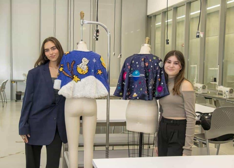 Ana Karen y María Fernanda explican que eligieron la temática del espacio exterior para sus creaciones. La primera incorporó peluche, de manera que su cliente “se mantenga calientito”. La segunda confeccionó su prenda en satín. Ambas introdujeron detalles bordados. Planetas y estrellas adornan las prendas.