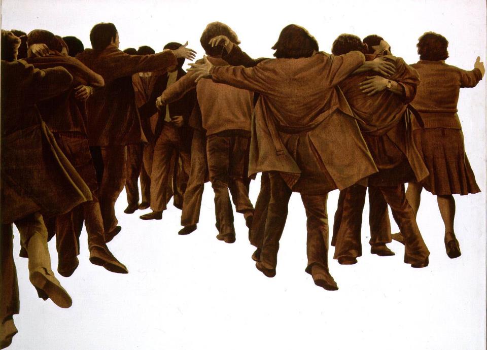 El cuadro muestra a un grupo de personas de espaldas, aunque creemos ver sus sonrisas. Visten gabardinas, jerséis, faldas de tabla, y se abrazan. Desbordan camaradería a pesar de la unidad del marrón –el color de la transición–. El lienzo fue creado en 1976 por Joan Genovés, pintor de multitudes, y cobró un enorme valor simbólico: la reconciliación entre dos Españas. A finales de la década, un coleccionista de Chicago se hizo con la obra, aunque luego comprendió que estaba demasiado vinculada a la memoria colectiva y accedió a cambiarla por otro Genovés. Fue Adolfo Suárez quien logró que regresara: el Estado compró El abrazo a la Marlborough por medio millón de pesetas. Pero ocurrió algo inexplicablemente muy español: acabó preso en los almacenes del museo durante décadas.