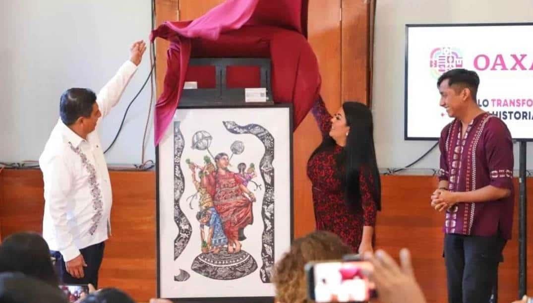 La nueva obra elegida se trata de "El festejo de Centéotl", de la artista Malinali Yuma García Díaz, realizada en técnica de acrílico y de estilo surrealista, informó el gobierno de Oaxaca.