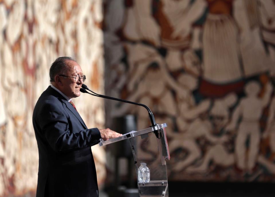 "Lamento mucho que no haya podido venir el señor presidente. Quería contarle que el muralismo mexicano es el arte monumental de México para la humanidad, es la gran película fija, la gran escenografía, la gran epopeya (...)", inició su discurso.