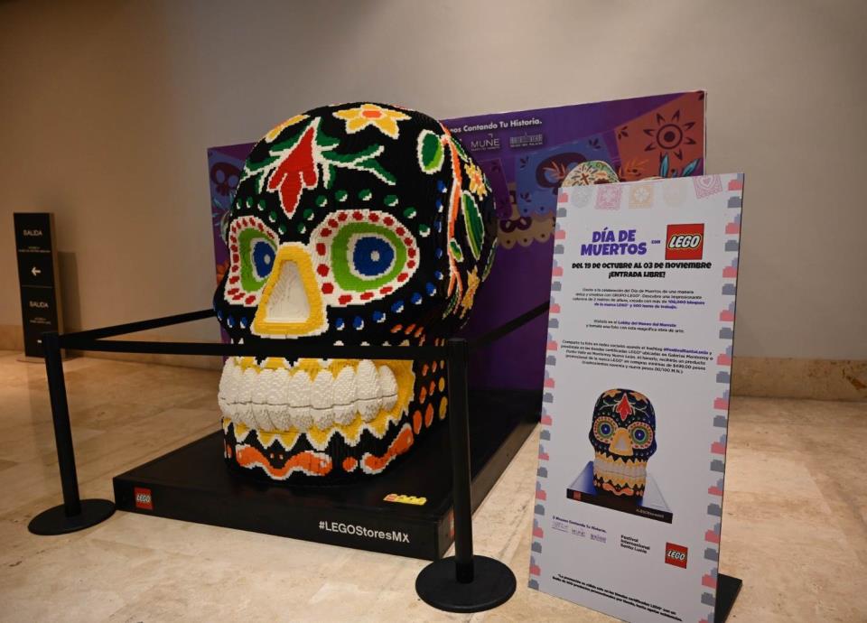 En una colaboración del Festival Santa Lucía y LEGO con el Museo del Noreste, esta alegoría, que remite a las calaveras de azúcar que se colocan en los altares y ofrendas de muertos, requirió de 500 horas de trabajo para su ensamblaje.