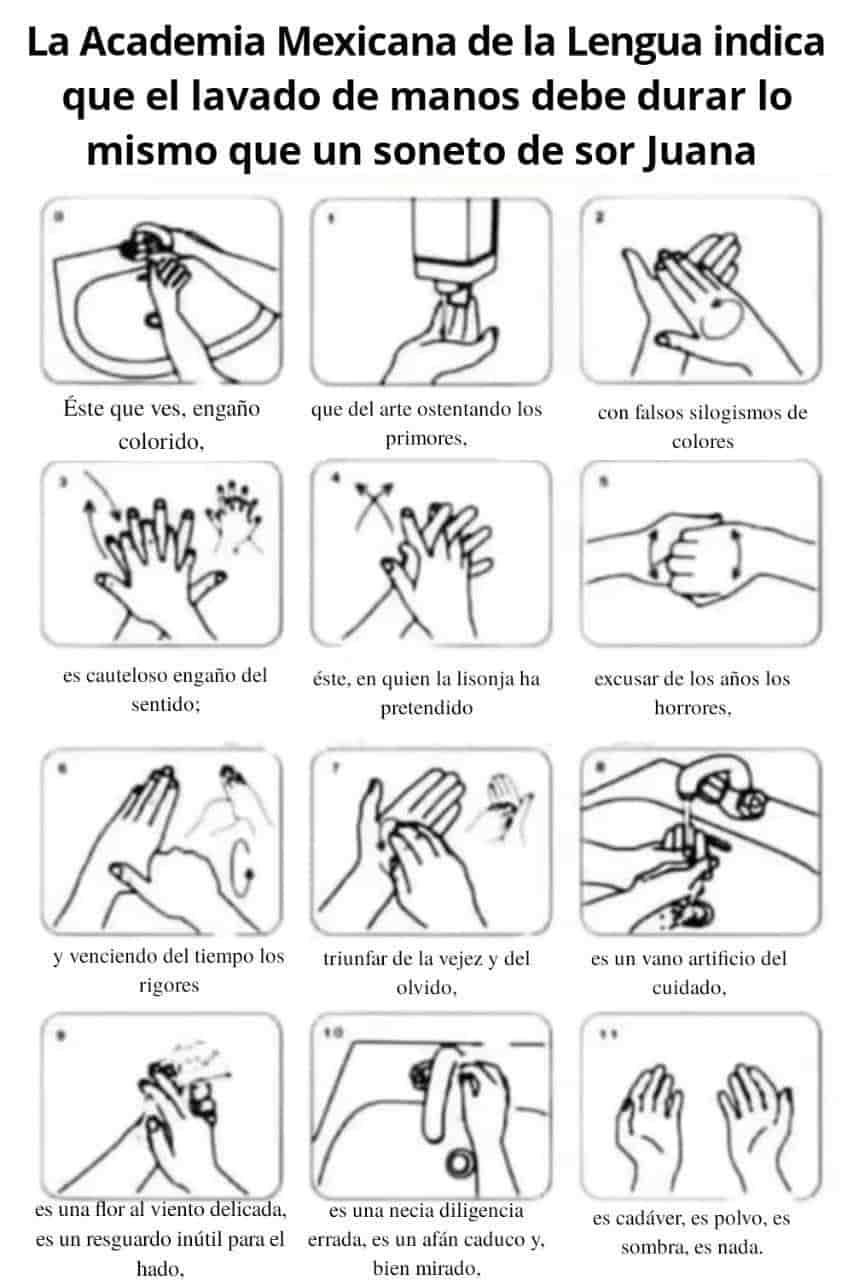 CIUDAD DE MÉXICO.- La Academia Mexicana de la Lengua ( AML) compartió en su cuenta de Twitter una recomendación sobre el lavado de manos. Con un esquema que indica el paso a paso del lavado correcto y completo, esta institución indicó que el tiempo dedicado debe durar lo mismo que un soneto de Sor Juana Inés de la Cruz.