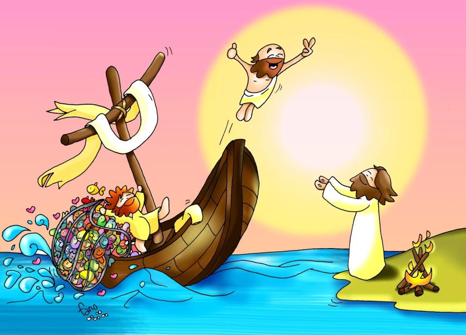 El Evangelio de hoy nos relata la tercera aparición de Jesús resucitado a sus discípulos. Esta vez no se presenta en medio de ellos a puertas cerradas, sino al aire libre, a orillas del mar de Tiberíades. Tampoco están presentes todos los discípulos sino sólo siete de ellos.
