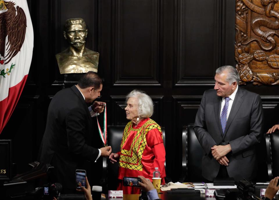 Para acallar el sainete que caldeó los ánimos de los legisladores, el presidente de la Mesa Directiva del Senado, Alejandro Armenta, apuró la imposición a Elena Poniatowska de la máxima condecoración que entrega el Estado mexicano. Y Poniatowska aplacó aún más el desencuentro con un discurso en el que enlistó a un sinfín de creadores, artistas, escritores, actores políticos, luchadores sociales y activistas a los que conoció y entrevistó a largo de su vida; una lista en la que ocuparon un lugar central sus tres hijos: Emmanuel, Paula y Felipe; sus nietos, su madre, su abuela y sus amigos, encabezados por la escritora y feminista Marta Lamas.