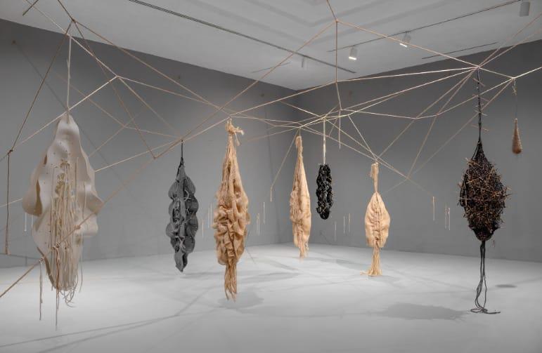 En la tercera sala predominan las esculturas trabajadas con procesos más relacionados con ensamble, tejido y unión, que refieren a formas similares a los capullos de la naturaleza. La serie de esculturas Semillas de jabim I, II y III, (2024) así como Estructura de semilla de jabim I-III (2024-5) y Capullo (2023), se presentan suspendidas desde el techo mediante un tejido que las conecta.