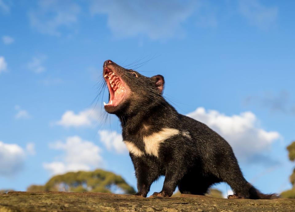 El demonio de Tasmania es un marsupial nocturno de pelaje oscuro o negro, que desprende un fuerte olor cuando está nervioso.