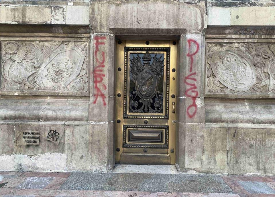Ya en el Monumento, con pintura en aerosol roja escribieron "Renuncia Diego", y con pintura azul solicitaron más "Presupuesto para la ENAH". Por esa acción, el Instituto Nacional de Antropología e Historia dijo que "condena enérgicamente los actos vandálicos perpetrados en contra del Ángel de la Independencia, un monumento de enorme valor histórico y entrañable para todos los mexicanos".