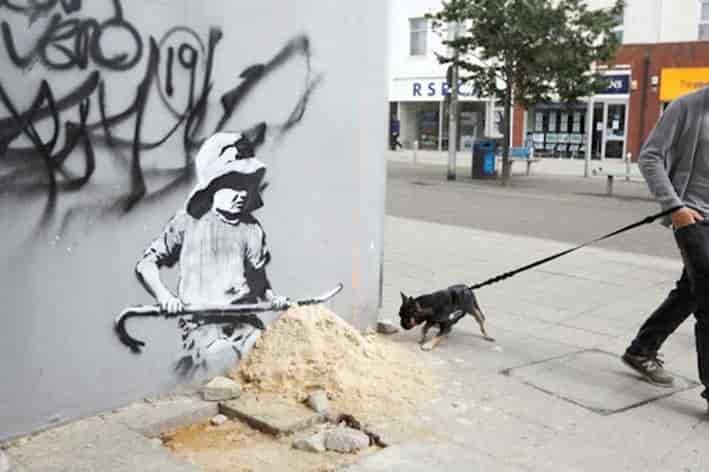 Un niño con una palanca montando un castillo de arena, el cual con el tiempo fue perdiendo su forma, es el protagonista de esta obra forma parte de "A Great British Spraycation", una serie que realizó Banksy durante el verano en varias partes de Reino Unido.