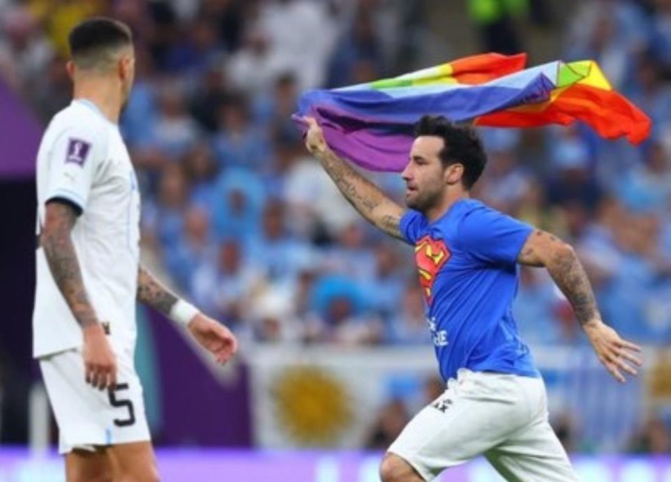 Siguen las polémicas por protestas en la Copa Mundial de Qatar 2022, ahora fue un aficionado que saltó a la cancha del Estadio Lusail durante el encuentro entre Portugal y Uruguay para protestar con una bandera de arcoíris.