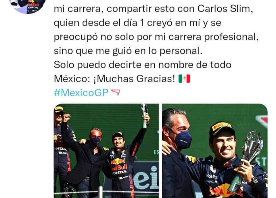 Checo Pérez, quien está teniendo un cierre espectacular de temporada en la Fórmula 1 y el cual viene de tres podios consecutivos con el equipo Red Bull, mismos que a su vez han ayudado para que Max Verstappen se aleje y lidere el Mundial de Pilotos sobre Lewis Hamilton, además de que la escudería austriaca esté a un punto de Mercedes en el de Constructores, agradeció que todo esto que está pasando en estos momentos en su carrera deportiva, en su momento todo esto pueda pasar por una persona, y esa es Carlos Slim Domit, el hijo del magnate mexicano Carlos Slim.