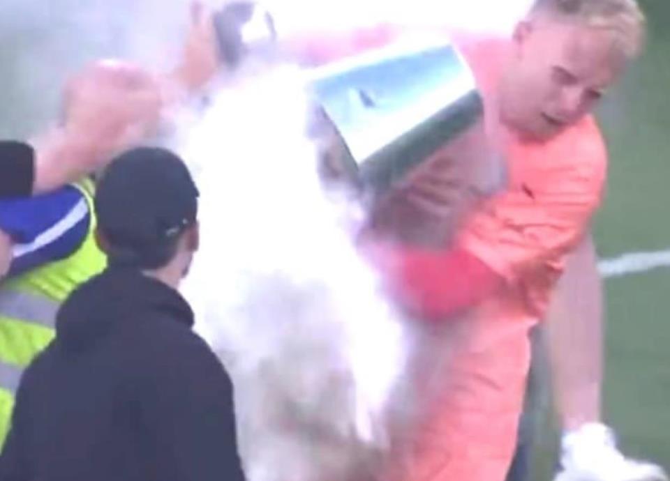 Esto sucedió en el Clásico del Futbol de Australia entre el Melbourne City y Melbourne Victory, lugar en el que hinchas del equipo visitante lanzaron bengalas de humo al campo de juego y ahí el portero se las regresó.