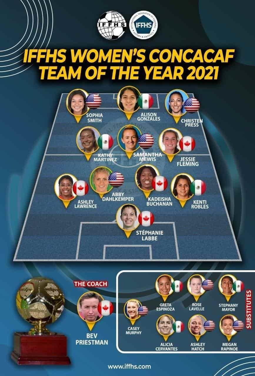 Katty Martínez, jugadora que será futbolista de América y dejará a Tigres, fueron las únicas futbolistas que entraron en el once ideal de la Concacaf en este 2021, aunque eso sí, en el banquillo hubieron cuatro más.La Iffhs dio a conocer el once ideal de la Concacaf en este 2021 y ahí aparecieron las goleadoras mexicanas de la Liga MX Femenil, además de la goleadora Kenti Robles, futbolista que milita en el Real Madrid.Además de Alison González y Katty Martínez, Stephanie Labb, Kadeisha Buchanan, Abby Dalkhember, Ashley Lawrence, Jessie Fleming, Samantha Mewis, Christen Presa y Sophia Smith fueron las futbolistas que integraron el once ideal de la Concacaf.Las jugadores mexicanas que aparecieron como suplentes en el equipo ideal de Concacaf en este 2021 fueron jugadoras como Greta Espinoza, Stephany Mayor y Alicia Cervantes.