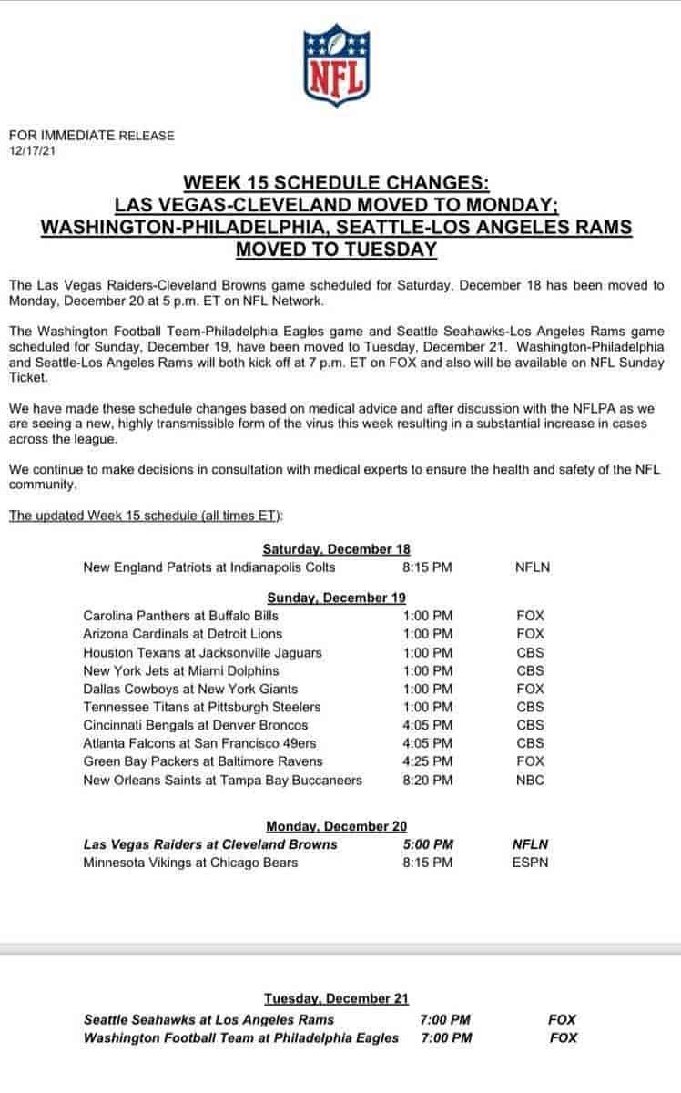 La semana 15 de la NFL sufrió diversos cambios en su calendarización luego de los numerosos casos de Covid-19 en las distintas franquicias