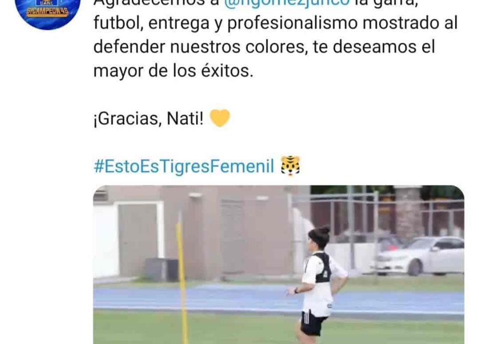 "Agradecemos a @ngomezjunco la garra, futbol, entrega y profesionalismo mostrado al defender nuestros colores, te deseamos el mayor de los éxitos. ¡Gracias, Nati! #EstoEsTigresFemenil ", destacó Tigres en sus redes sociales.
