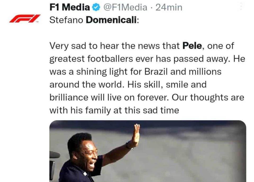 "Estoy muy triste de escuchar de que Pelé, uno de los mejores futbolistas de la historia, ha muerto. Nuestros pensamientos y los de la Fórmula 1 están con su familia", expuso Stefano Domenicali, el CEO de la F1.