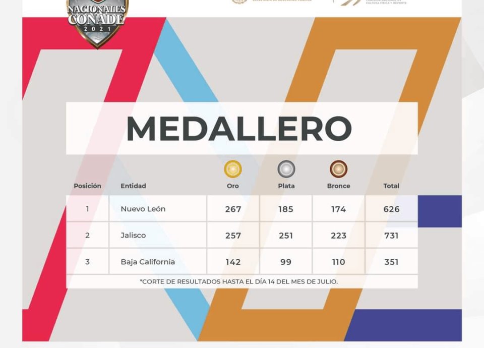 El Instituto Nacional del Deporte de NL informó poco antes del mediodía del día jueves el estatus actual del Medallero de los Nacionales Conade, siendo que ahí, Nuevo León lideraba en esta situación tras sumar 267 medallas de oro por las 257 de Jalisco.