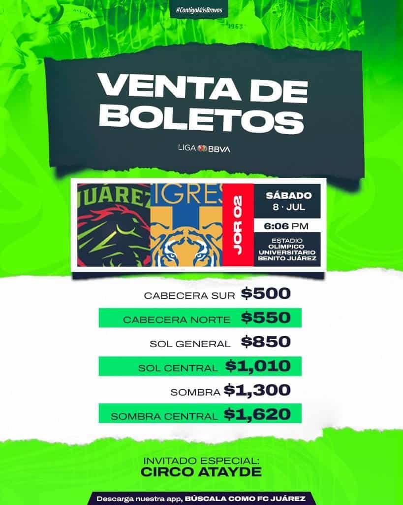 MONTERREY.- El precio de los boletos para el duelo de jornada dos en Ciudad Juárez entre Bravos y Tigres en este Torneo Apertura 2023 de la Liga MX que será el próximo sábado ocho de julio, tuvo un aumento en los costos.