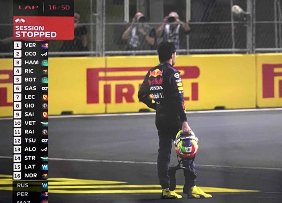 Sergio Pérez, piloto mexicano de Red Bull, abandonó por un choque la carrera en el Gran Premio de Arabia Saudita.