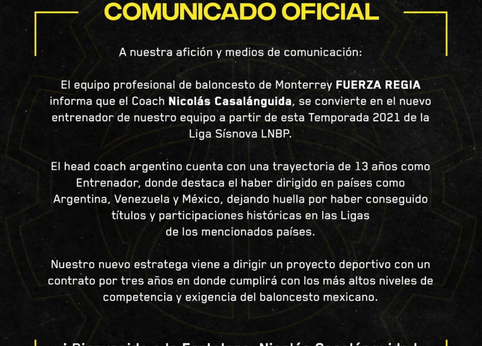 Tendrá el difícil objetivo de sustituir al Coach Paco Olmos, estratega con el que el conjunto regio ganó tres títulos en cinco años.