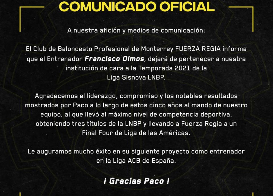 El cuadro regio informó esta situación y agradeció, a su vez, al Coach Francisco Olmos, quien como entrenador del cuadro regio logró tres campeonatos de la LNBP en tan solo cinco años.
