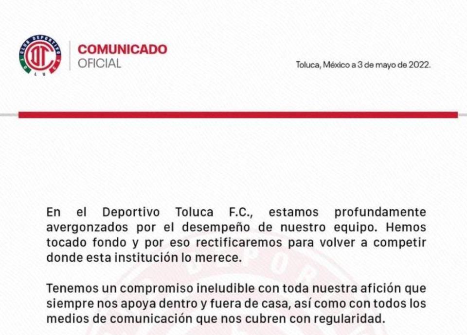 Conscientes de que fracasaron en este Torneo Clausura 2022 de la Liga MX luego de ni siquiera alcanzar el Repechaje, en el Toluca se sienten avergonzados por su mal semestre y aceptaron que pagarán la multa millonaria que les pondrá la Liga MX, todo esto al terminar entre los tres peores equipos del campeonato mexicano en el tema porcentual.