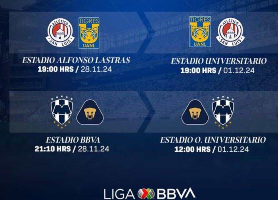MONTERREY.- Rayados y Tigres jugarán el próximo jueves y domingo sus duelos ante Pumas y Atlético de San Luis en los cuartos de final de ida y vuelta en el Torneo Apertura 2024.