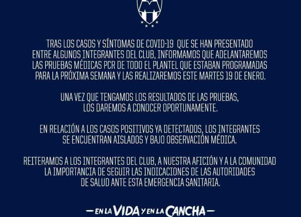 El Club de Futbol Monterrey informó en sus redes sociales que el próximo martes someterán al equipo a otra prueba PCR y esta será como un adelanto tras los brotes masivos de COVID-19 en la institución, en donde cabe señalar que también algunos jugadores de las fuerzas básicas han contraído la enfermedad.