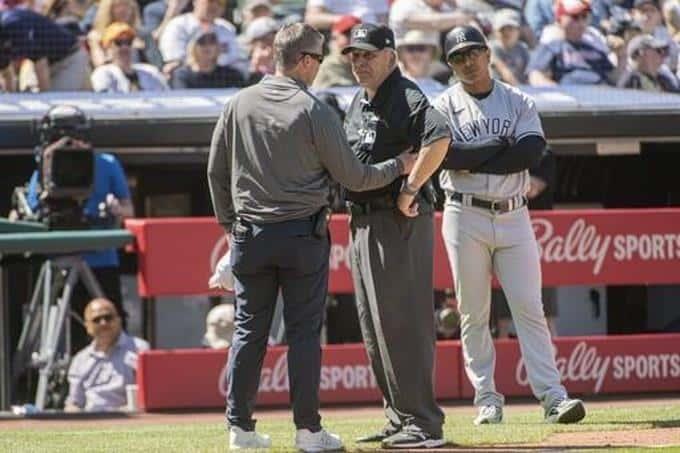 El pelotero Andrés Jiménez de los Guardianes de Cleveland, en su afán de evitar una carrera de los Yanquis de Nueva York, lanzó la pelota a la segunda base en ese partido y ahí impactó por accidente el rostro de ese umpire.