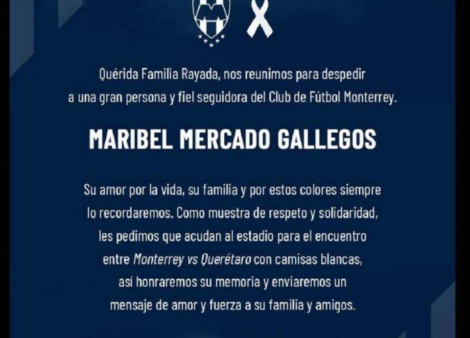 Antes y después del partido entre Monterrey y Gallos de la fecha cuatro de la Liga MX, la afición de Rayados le dará el pésame a la familia de Maribel Gallegos, quien murió el domingo pasado a las afueras del estadio TSM de Torreón de Santos y después de ser atropellada por una persona que iba manejando una camioneta.
