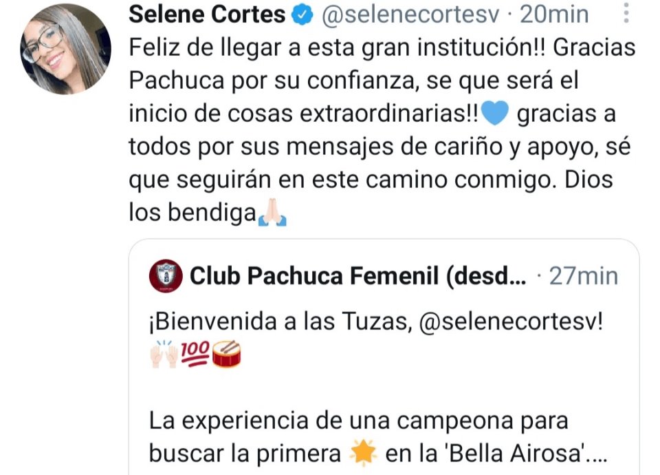 "Feliz de llegar a esta gran institución!! Gracias Pachuca por su confianza, se que será el inicio de cosas extraordinarias!! gracias a todos por sus mensajes de cariño y apoyo, sé que seguirán en este camino conmigo. Dios los bendiga", expresó Cortes en Twitter.
