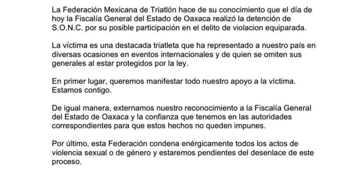 La Fiscalía General de Justicia del Estado de Oaxaca detuvo a un entrenador por aparentemente haber abusado sexualmente de una deportista afiliada a la Federación Mexicana de Triatlón.