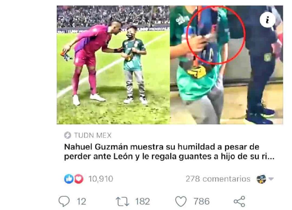 "El "Nahuel Bueno" no vende", dijo Nahuel Guzmán en un tweet mientras respondía una publicación de un aficionado de Tigres, quien destacaba la acción del citado portero mientras éste regalaba sus guantes al hijo de Jean Meneses.