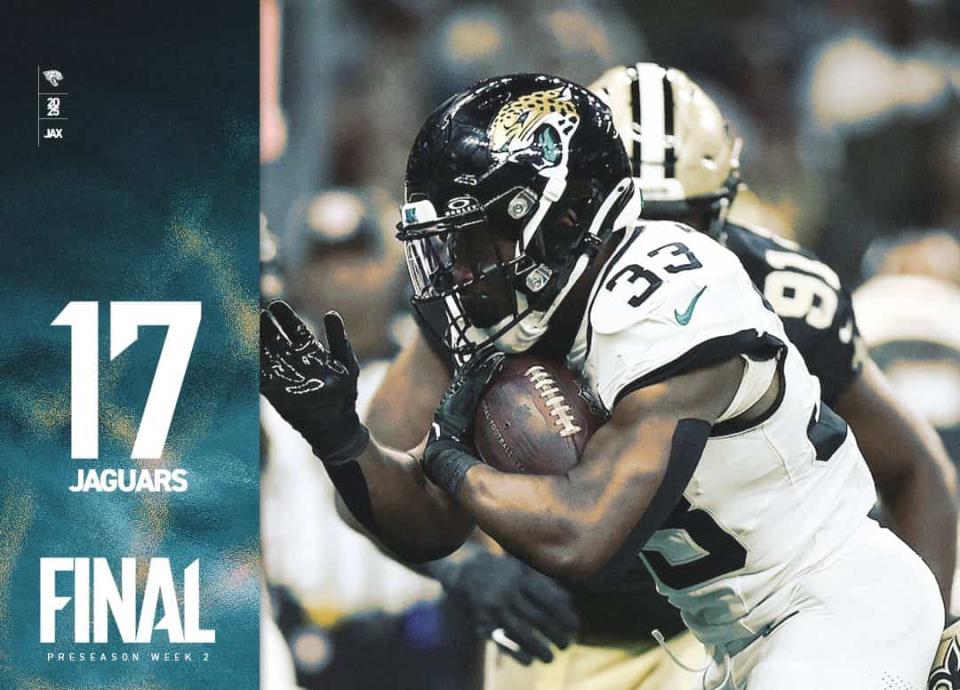 En más actividad de la semana tres de la pretemporada en la NFL, los Jaguares de Jacksonville y los Santos de Nueva Orleans igualaron a 17 puntos.