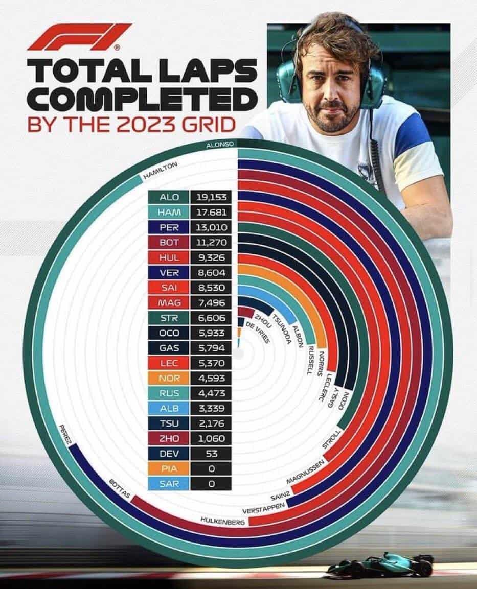 Sergio Pérez es el tercero con más vueltas dadas en la máxima categoría del automovilismo a nivel mundial.Pérez ha completado un total de 13 mil 010 vueltas y eso ha sido en sus 12 temporadas de Fórmula 1 que lleva en su historial.Solo es superado por las 17 mil 681 de Lewis Hamilton y las 19 mil 153 de Fernando Alonso, siendo ellos unos pilotos aún más experimentados que el mexicano.El mexicano lleva en la Fórmula 1 desde el 2011, mientras que Hamilton desde el 2008 y Alonso desde inicios de los 2000.Dicho piloto mexicano se sigue preparando para su temporada de este año en la respectiva Fórmula 1.La primera carrera de Pérez dentro de este año en la Fórmula 1 va a ser el próximo 5 de marzo con el Gran Premio de Barhéin.