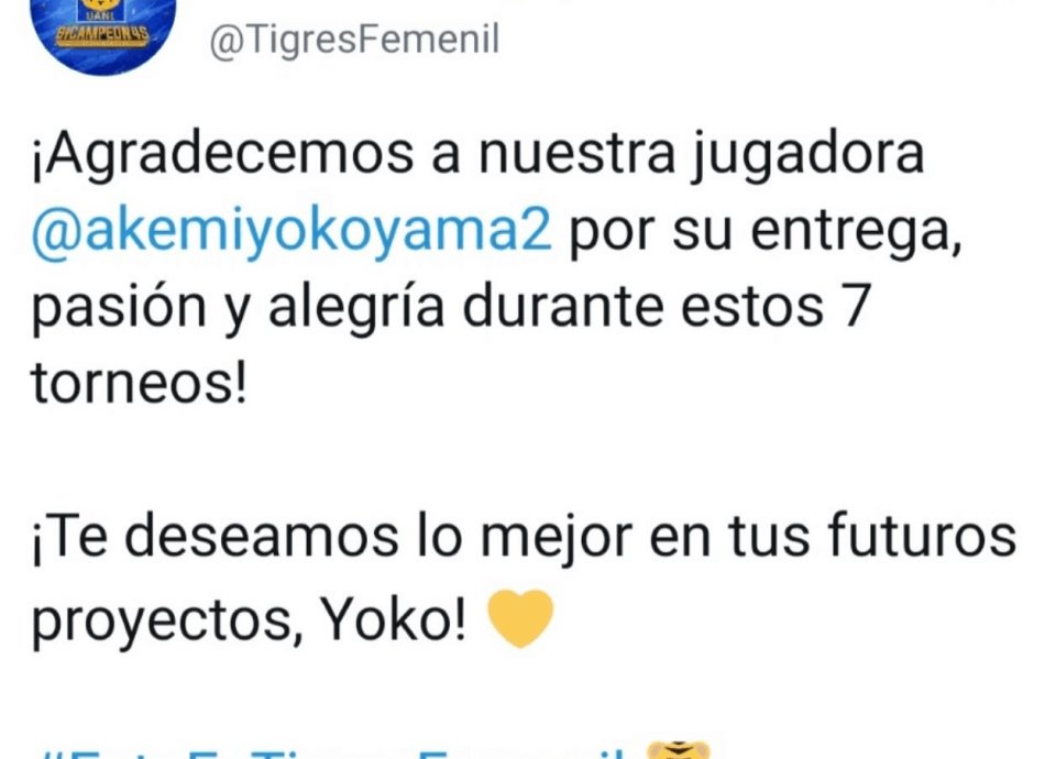 "Agradecemos a nuestra jugadora @akemiyokoyama2 por su entrega, pasión y alegría durante estos 7 torneos! ¡Te deseamos lo mejor en tus futuros proyectos, Yoko! ", informaron las felinas en redes sociales.