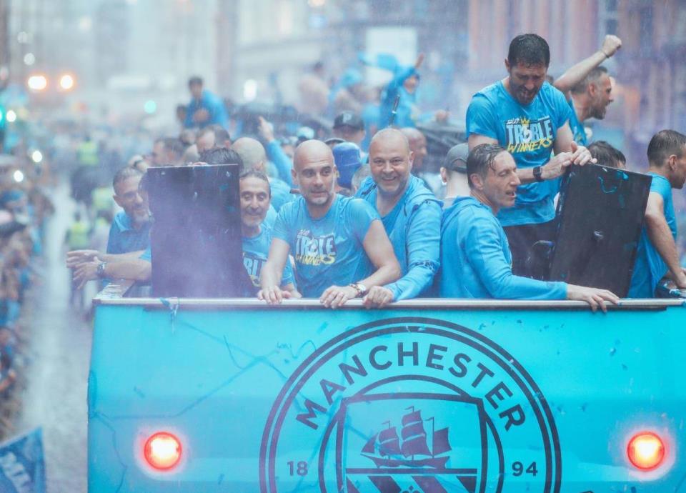 El técnico Pep Guardiola también festejó en el recorrido y lo hizo con un puro, emulando su festejo de días atrás cuando ganó este equipo el título de la Premier League.