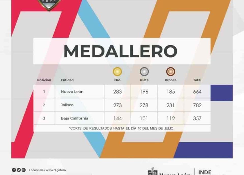 Con esto, Nuevo León fue el estado que más preseas ganó en el Medallero de los Nacionales Conade hasta el día sábado, situación que se espera continúe así en los próximos días en las distintas disciplinas que se efectúen en las distintas partes de la República Mexicana.