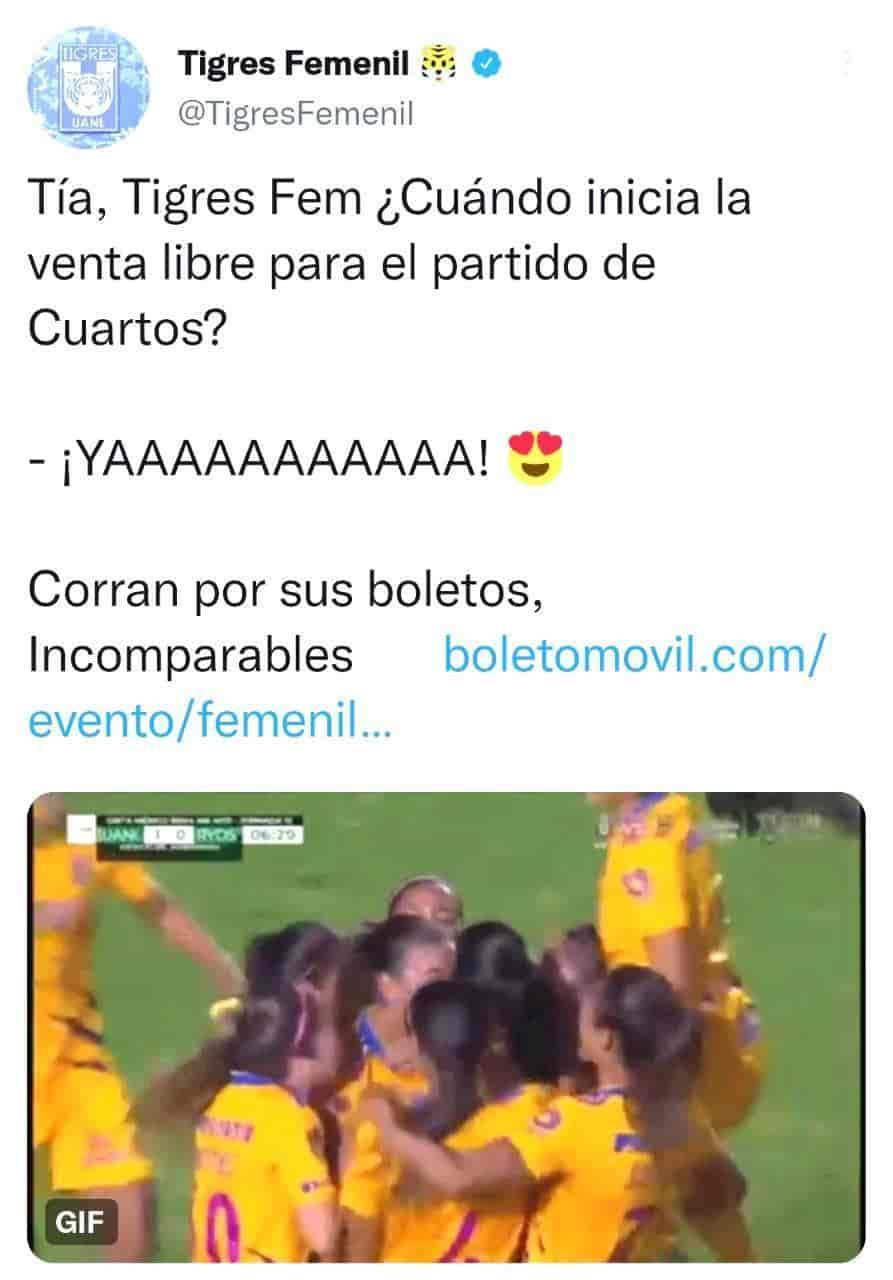 La venta libre para el juego de vuelta de Cuartos de Final entre Tigres y Cruz Azul del próximo lunes en la Liga MX Femenil ya comenzó.
