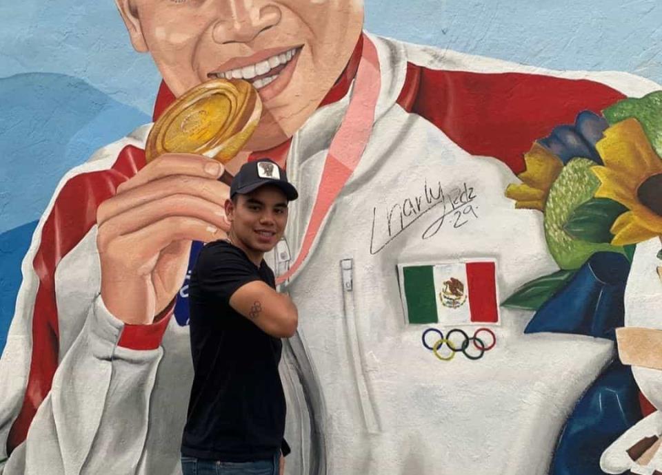En el mural se logra observar el momento en el que dicho jugador consiguió la medalla de bronce en los Juegos Olímpicos de Tokio.
