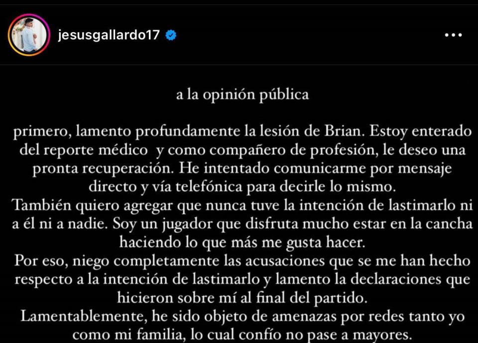 "Lamentablemente, he sido objeto de amenazas por redes tanto yo como de mi familia, lo cual confío no pase a mayores. Reconozco y agradezco a Jona dos Santos ya que se acercó conmigo en las últimas horas para disculparse. Estimo mucho a Jonathan por los momentos que hemos compartido y aproveché para decirle tal cual fue lo que siento. Finalmente, repito que lo más importante es la pronta recuperación de Brian y que lo volvamos a ver lo más pronto posible en las canchas", detalló.