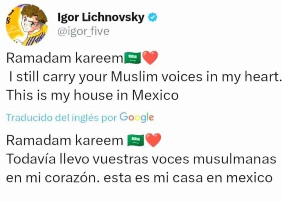 "Ramadam Kareem. Todavía llevo sus voces musulmanas en mi corazón, todo esto en mi casa de México", twitteó Igor Lichnovsky.