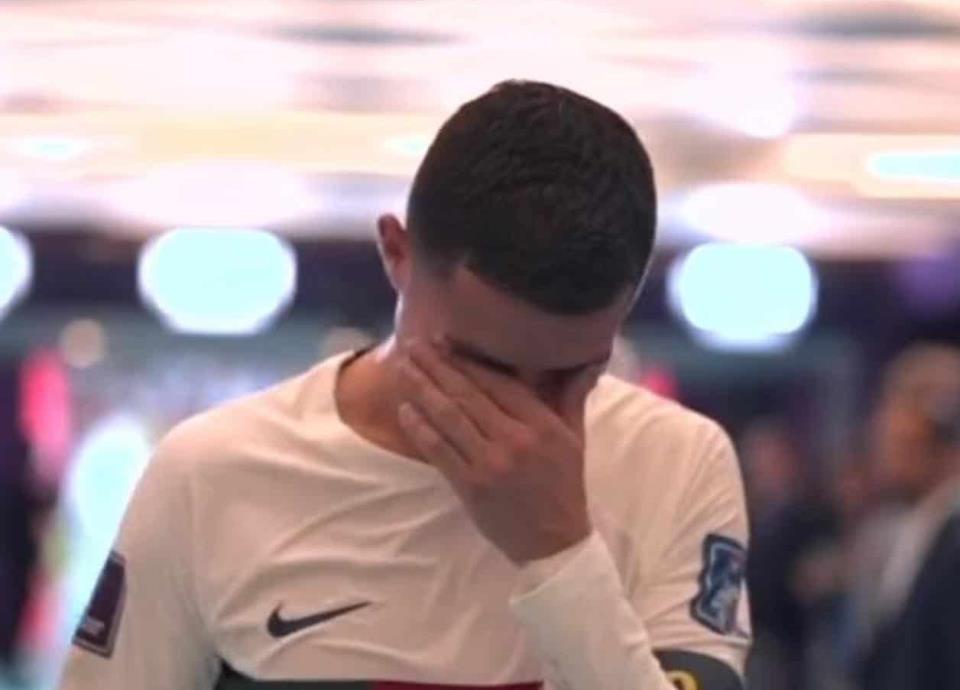 Acompañado de un miembro de la Selección de Portugal, CR7 fue visto cuando se dirigía a los vestidores del conjunto luso y se estaba tapando el rostro, pero ahí se le veía con claros índices de que estaba llorando.